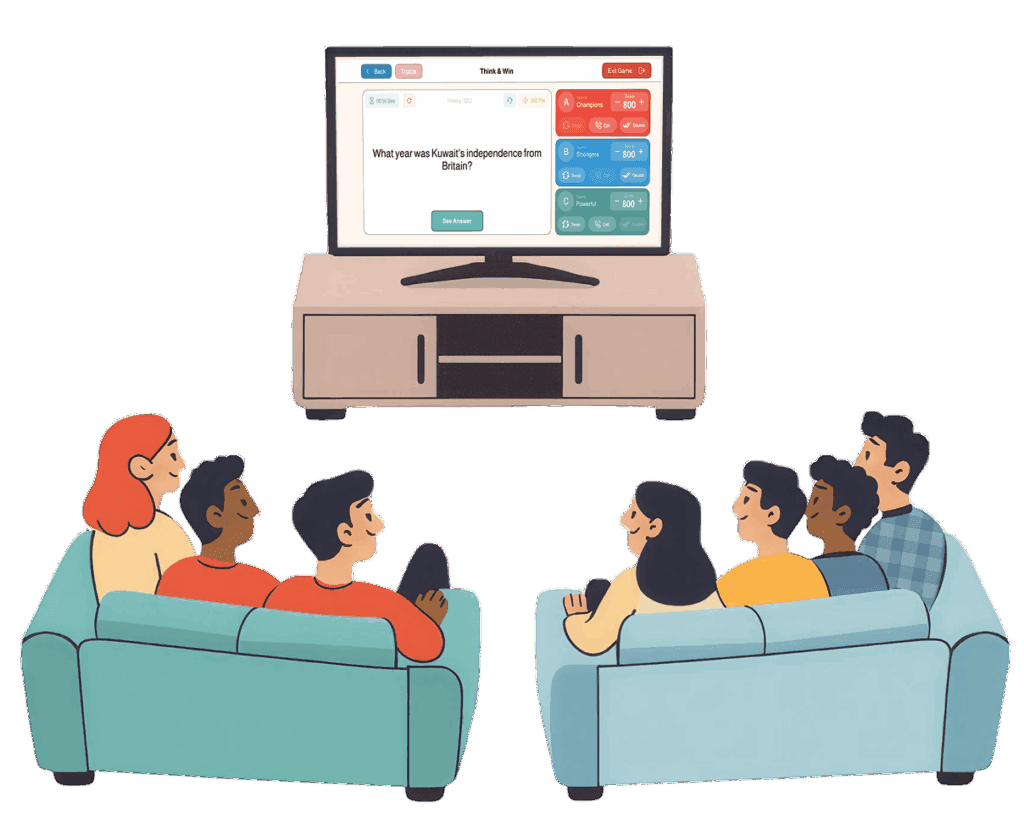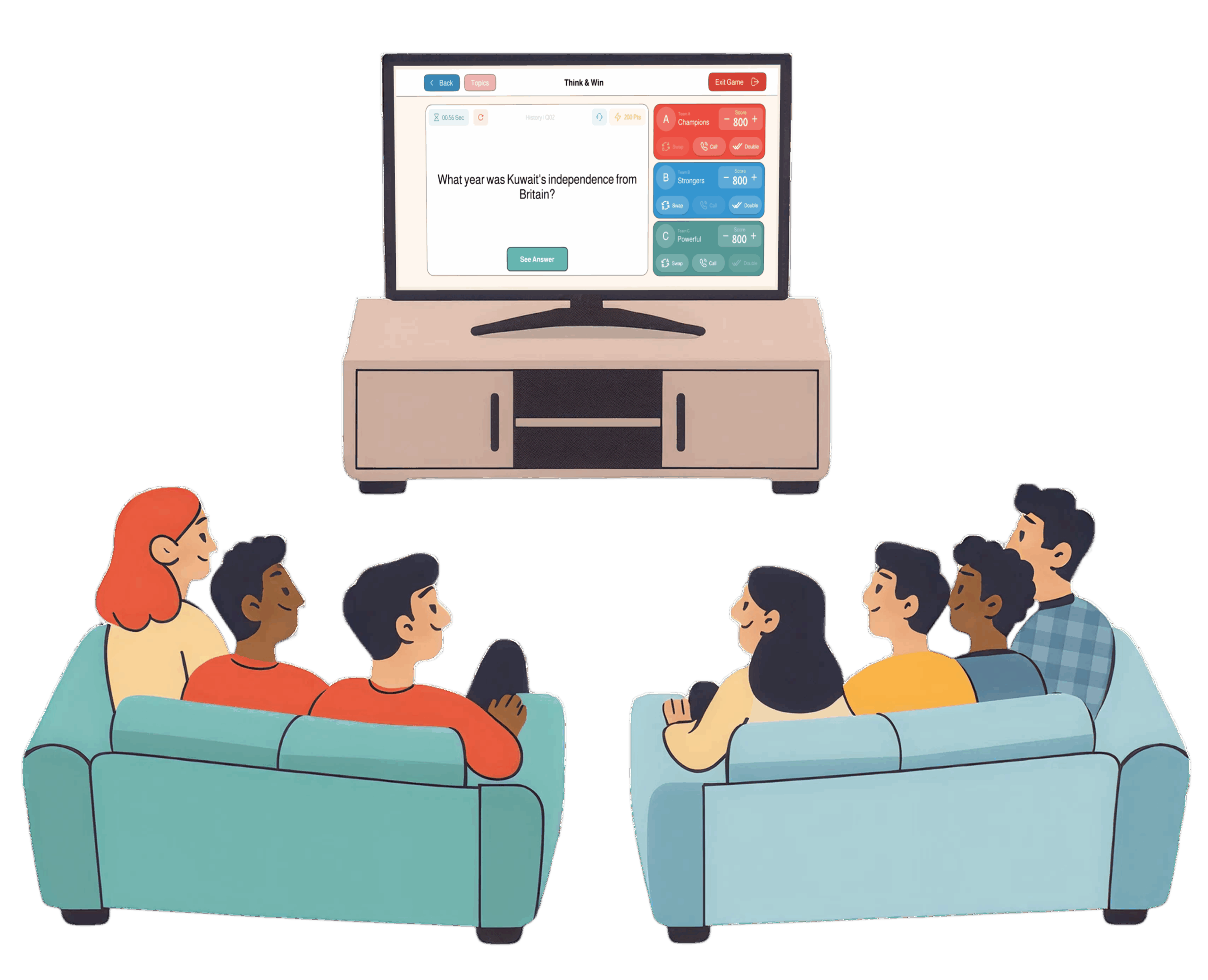 Play solo or with a group of up to 8 players in one shared room. Perfect for family game nights, friends, or remote parties.